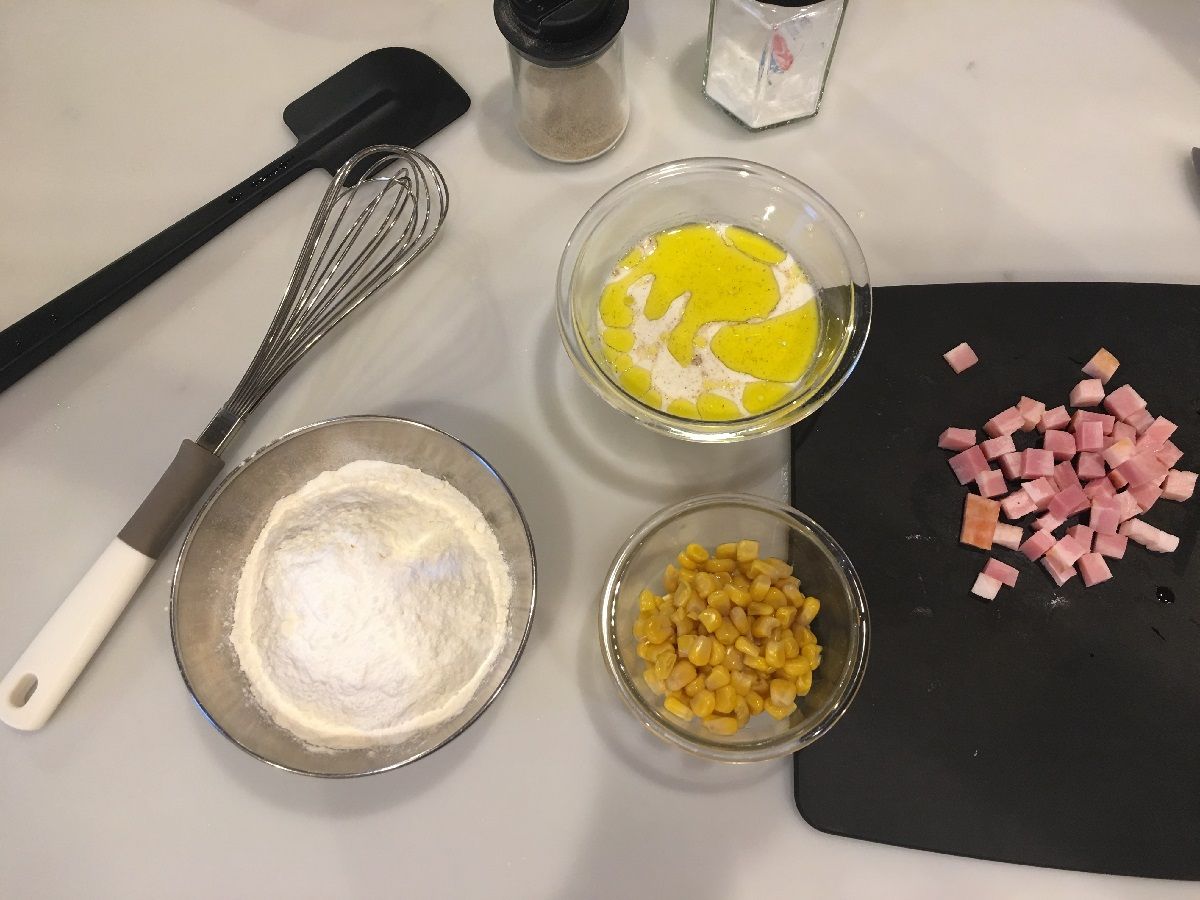 薄力粉とベーキングパウダーをあわせてふるっておいて、☆を入れてさっくりまぜあわせて、そこにコーンとベーコンを入れたら生地は完成~。