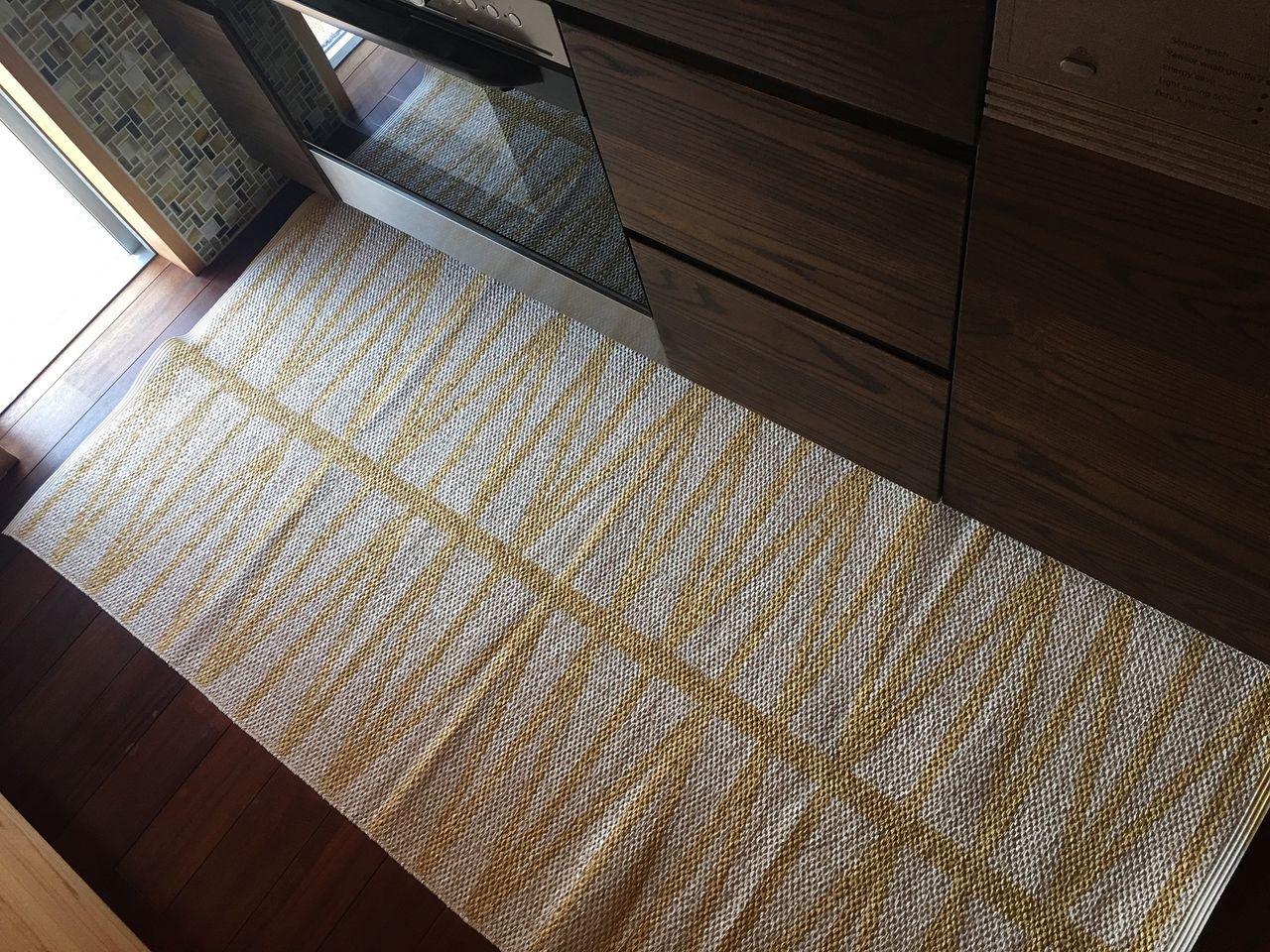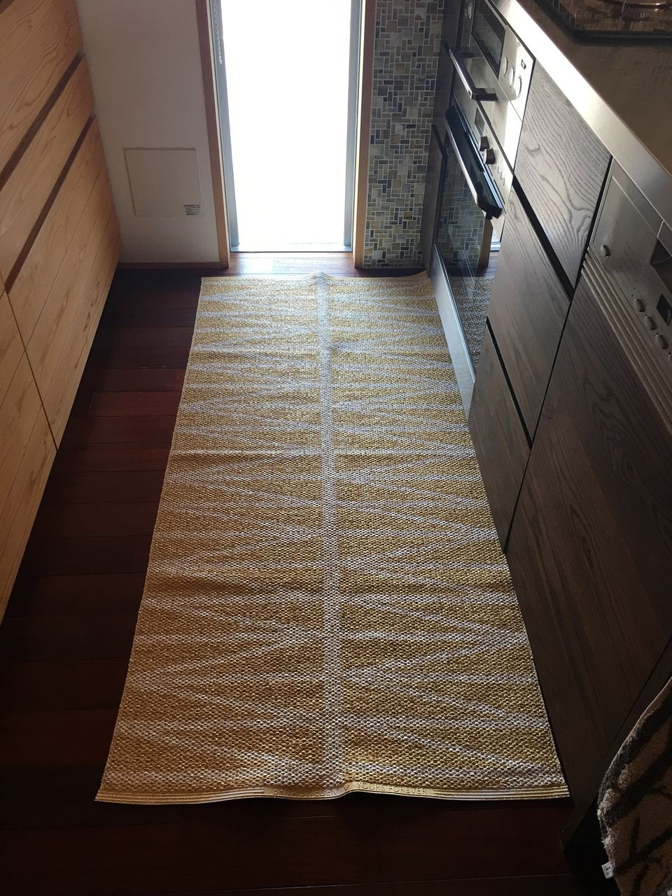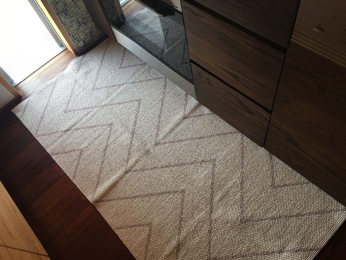 日本のキッチンマットよりも幅が広めだと思います。これがかなり快適で、しっかりキッチンを保護できます。なによりモダンなテキスタイルがインテリアとしても素敵なのですが・・・