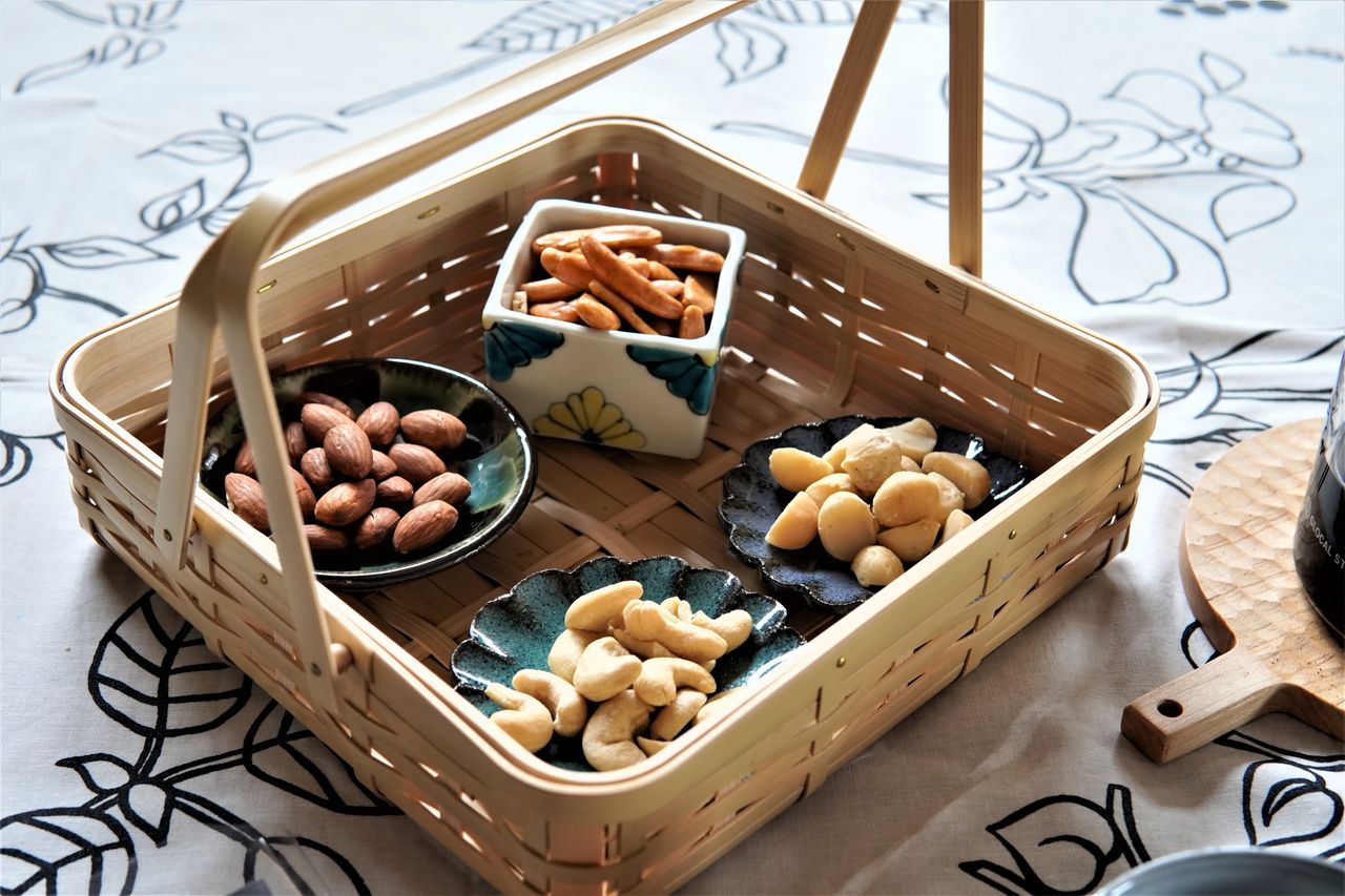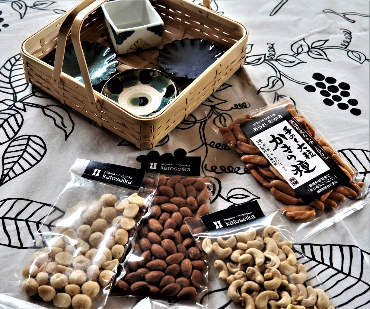 マカダミアナッツ、カシューナッツ、アーモンドと柿の種が分かれているので、好みでブレンドしてもよし、別々に食べてもよしと好みでブレンドできます。