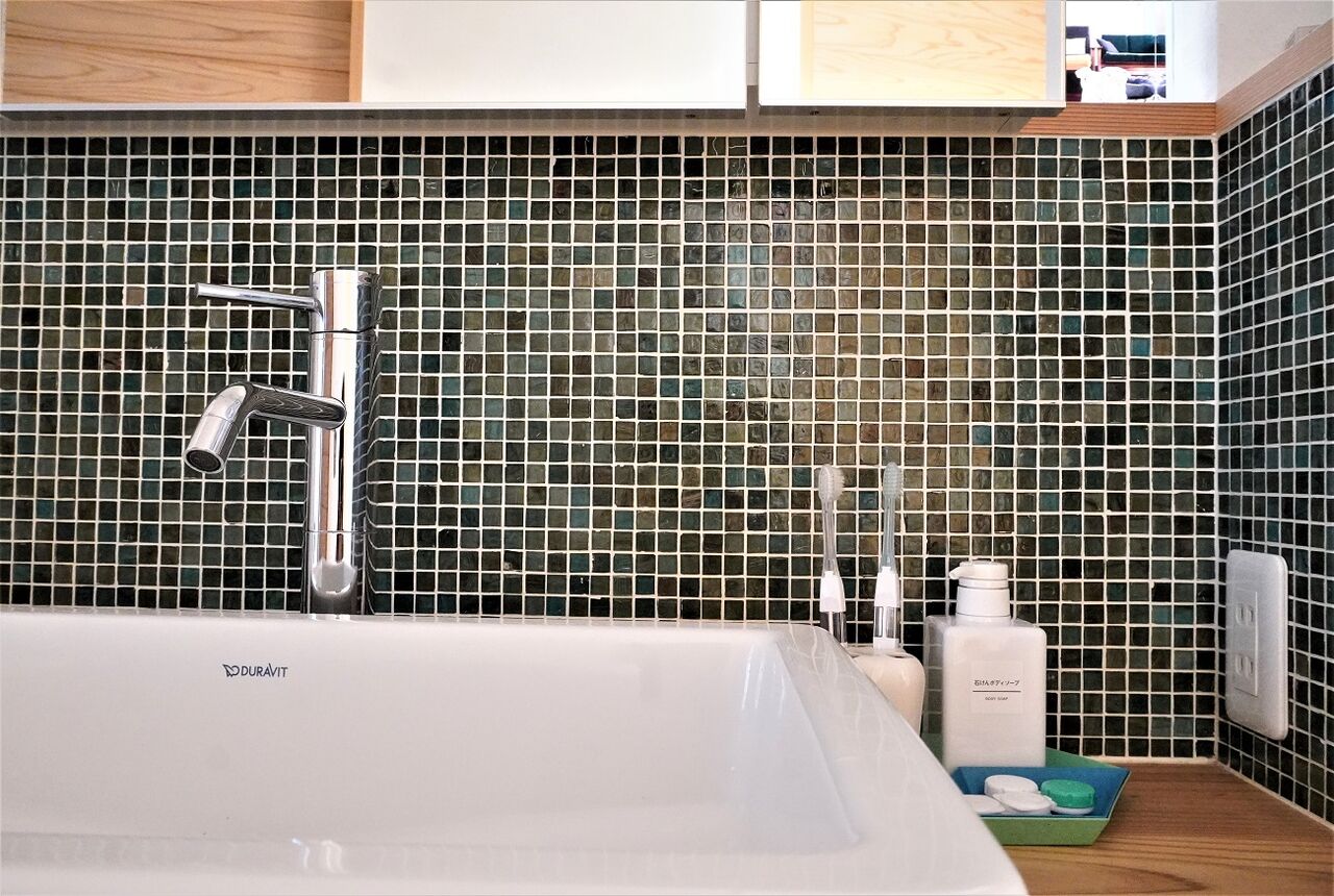 昼間でも薄暗い洗面スペースなので、