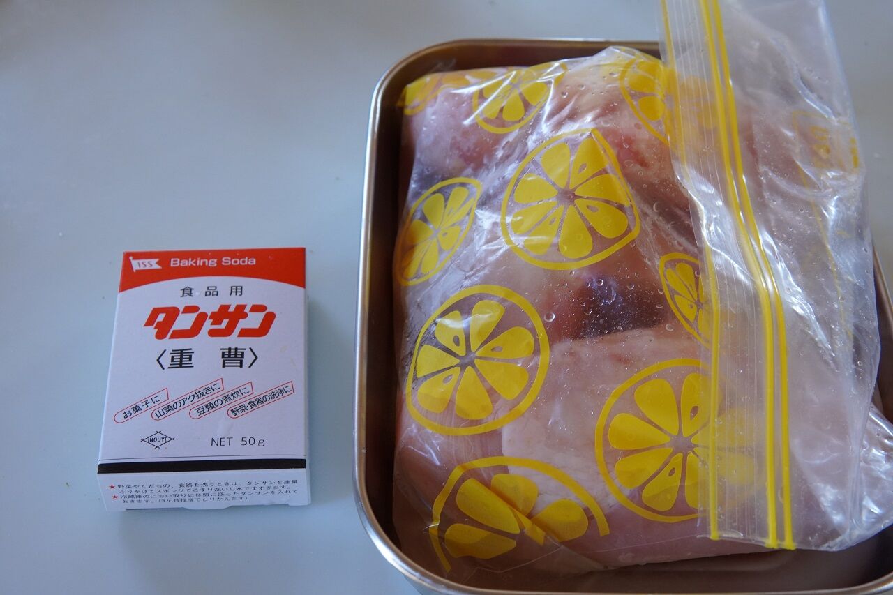 で、重曹に漬け込んだ後の鶏ムネ肉で作った