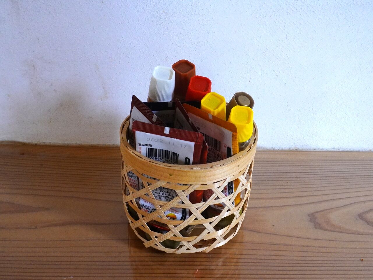 自宅にあった竹籠にまとめて野菜室に