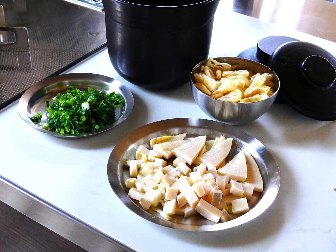 たけのこと揚げ、ねぎをカットして
