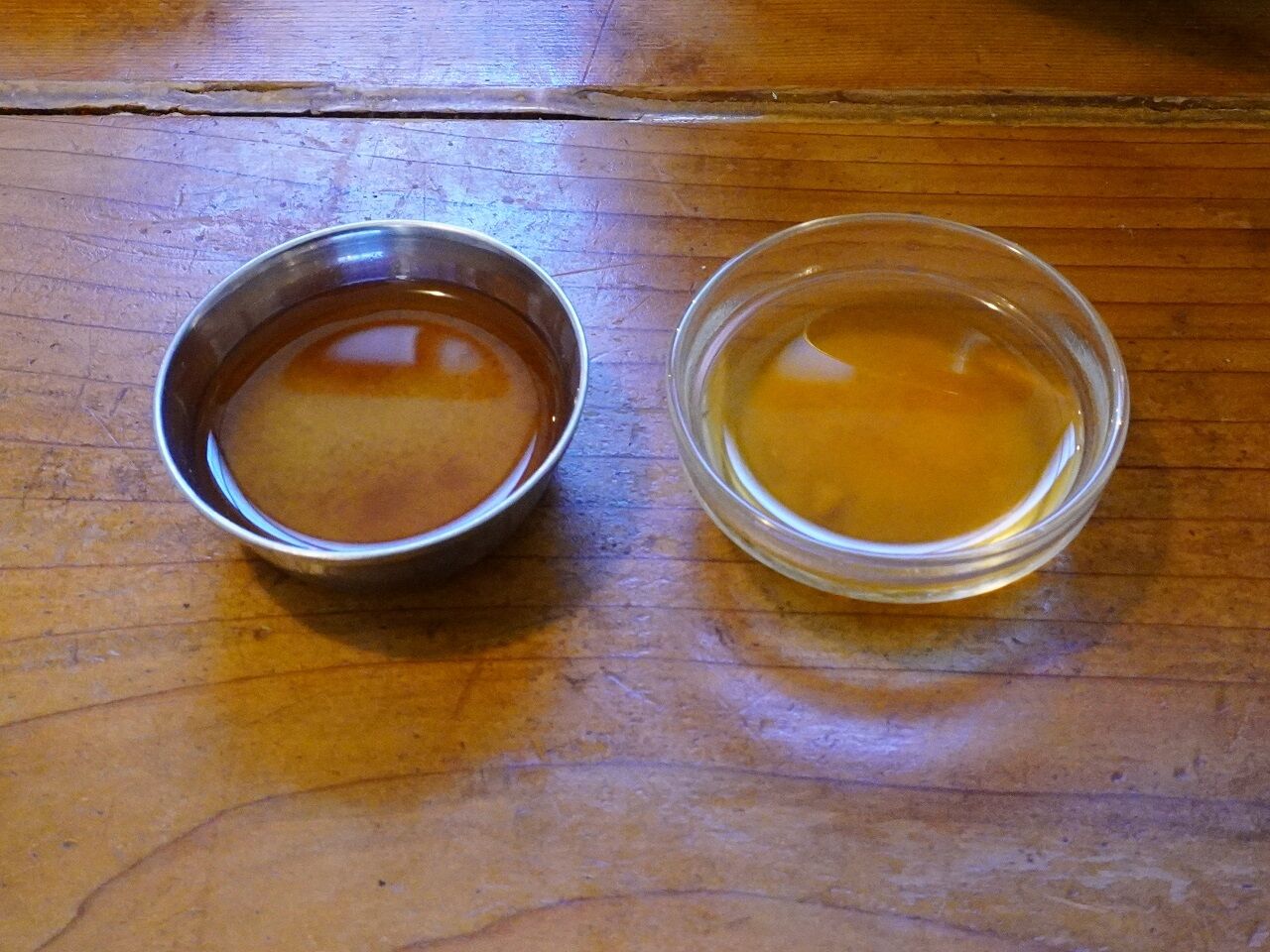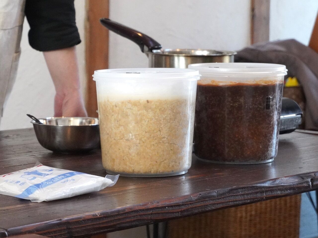 右の濃い色の容器が10ヶ月後の味噌が