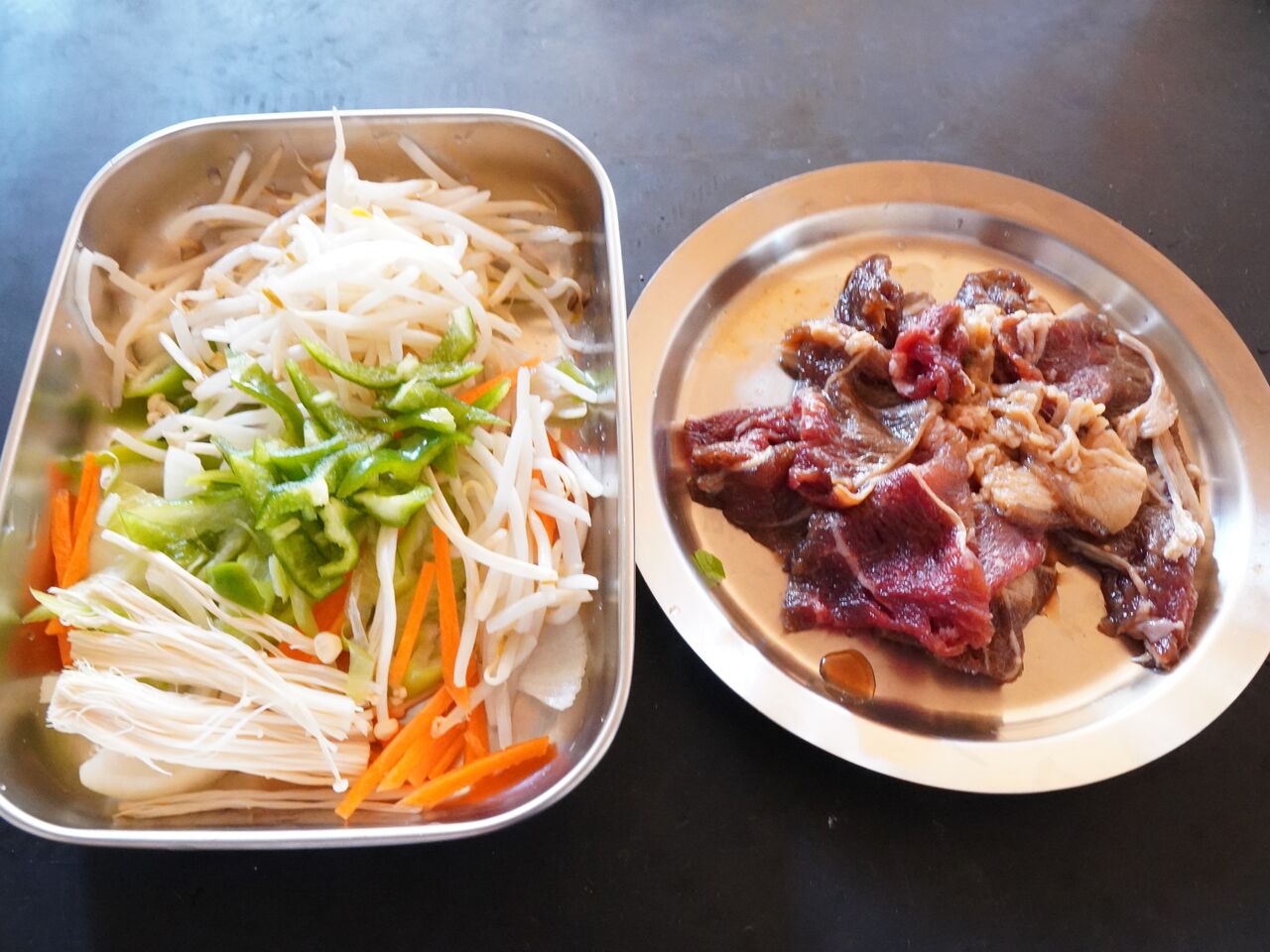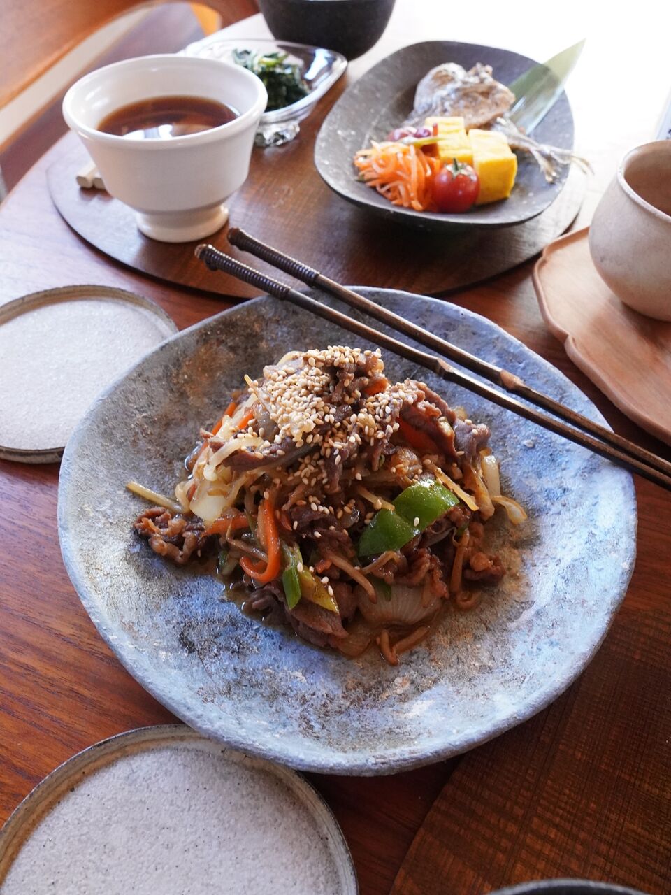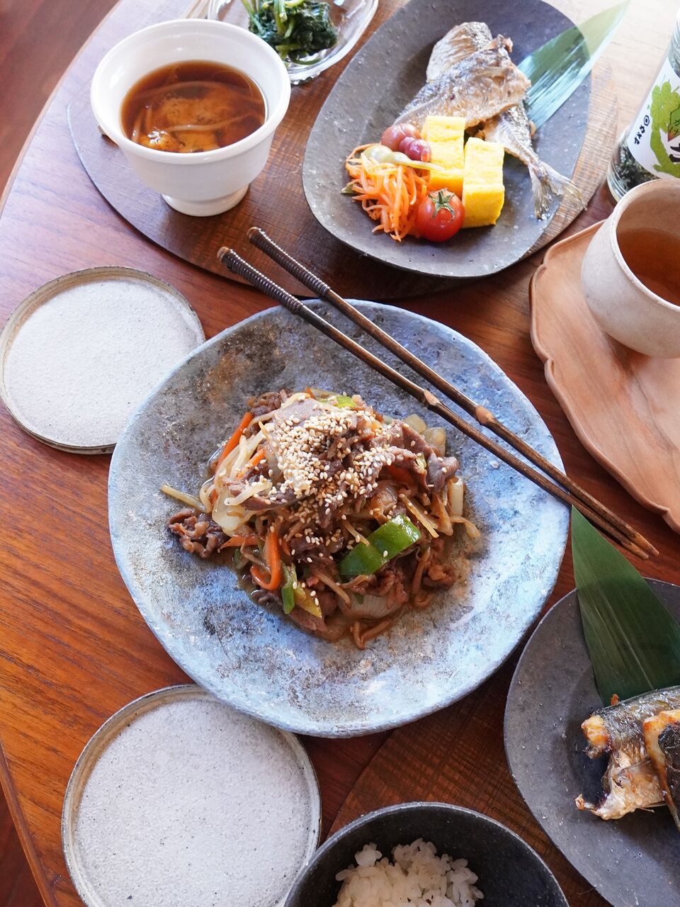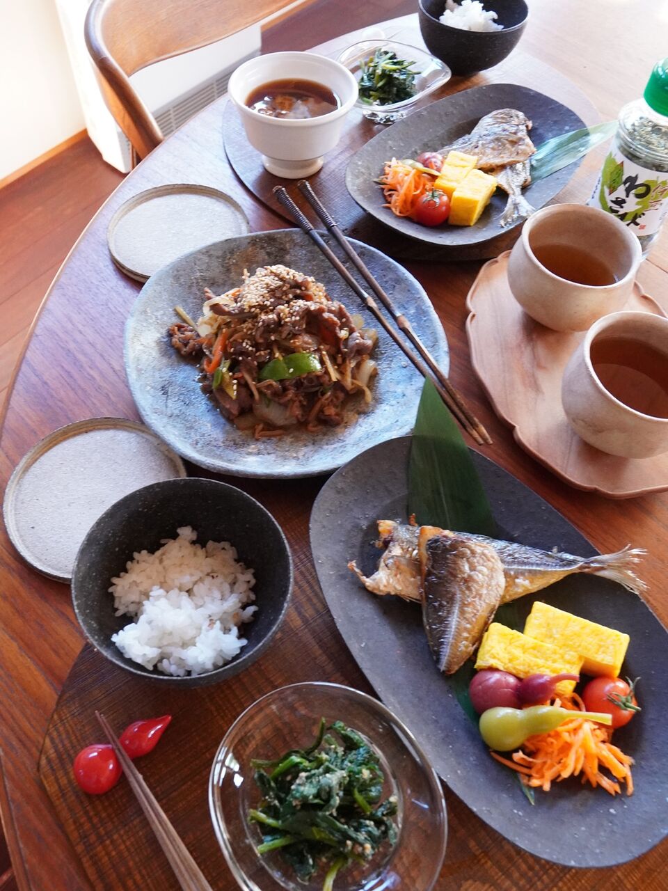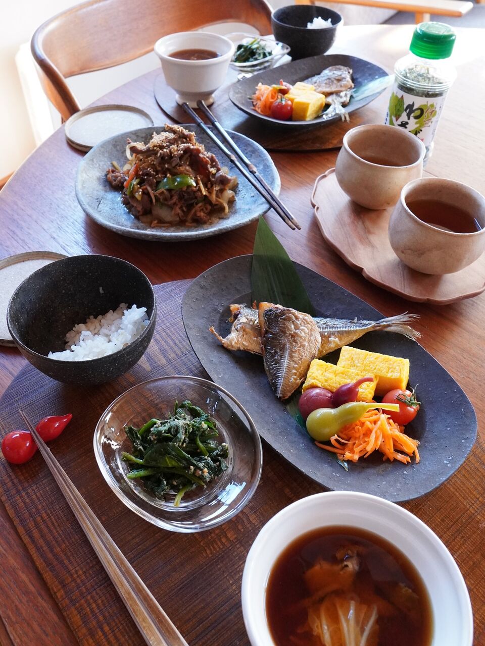 玉子焼き、お味噌汁、ほうれん草の胡麻和えや