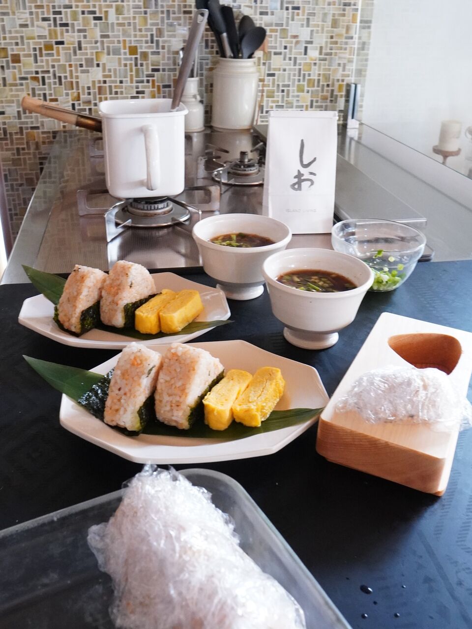 冷凍ストックおにぎり、お味噌汁、卵焼き、